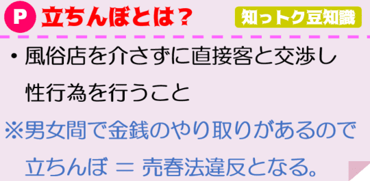 基本的に立ちんぼは許可を取ってその場所でお客さんを探しているわけではないため、違法です。