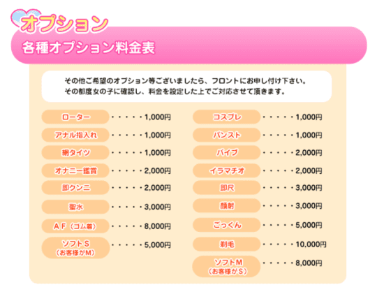 オプションは「1,000円:ローター・コスプレ・アナル指入れ・パンスト・網タイツ」「2,000円:バイブ・オナニー鑑賞・イラマチオ・即クンニ」「3,000円:即尺・聖水・顔射」「5,000円:ごっくん・ソフトS(客M)」「8,000円:AF(ゴム着)・ソフトM(客S)」「10,000円:剃毛」となり、AF・ソフトSM・剃毛など、楽しめるオプションが付いているのが個人的に嬉しいところです。