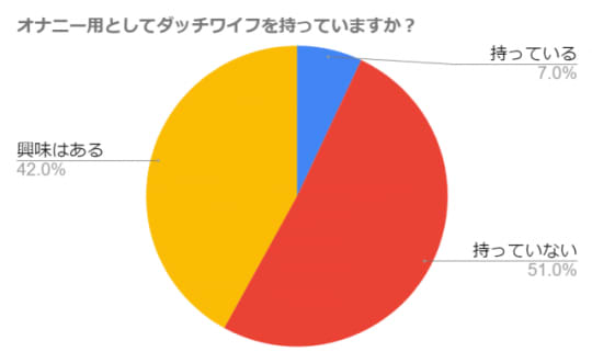 アダルトサイトが300人の成人男性に行ったアンケートによると、オナニー用のダッチワイフを所持している男性は約7%。全体から見ると少ない数字になりますが、42%の男性が「興味がある」と答えています。
