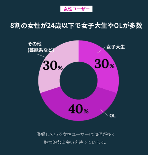 割合では20代のOLが一番多いものの、10代の女子大生の登録者数もかなりいます。10代でも安心して利用できるパパ活アプリです。