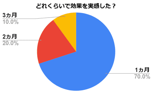 1ヵ月ほどで効果が出ていることを実感したという方が一番多いようです。とはいえ、効き目には個人差があります。