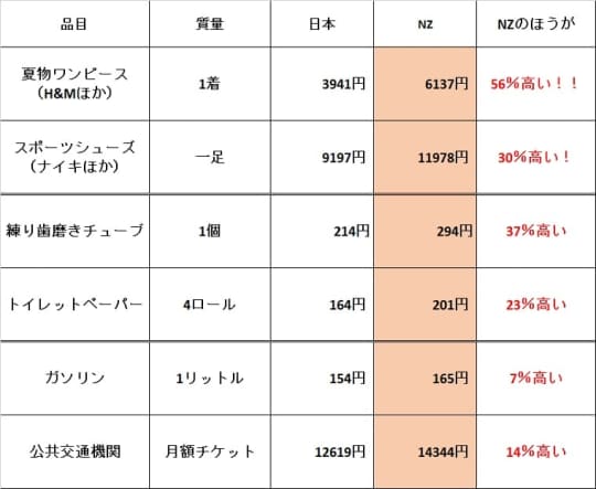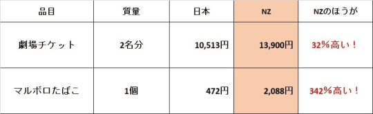 「日本とニュージーランドの物価比較」では、以下のように集計されています!