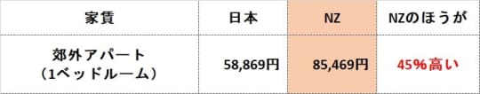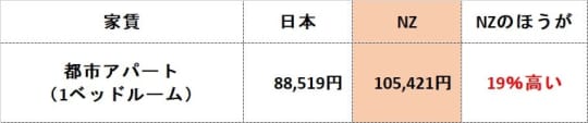 ニュージーランドと日本で、都市部のアパートメントの家賃を比較すると、以下のような結果に。