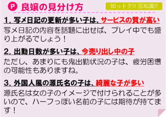まずは写メ日記にも着目しましょう。更新頻度の多い子は、サービスの質が高いことが多いですね。