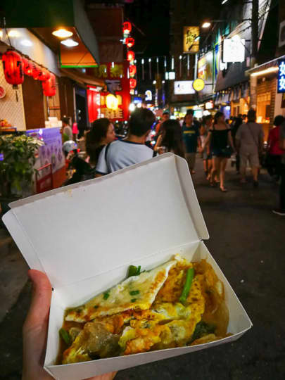 台湾のB級グルメのひとつ「牡蠣オムレツ」。夜市で絶対に食べてみたかったもので、ゴロゴロと入った牡蠣のオムレツにピリ辛ソースがかかっていてとても美味しかったです!