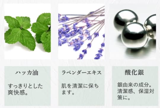 成分として9種類の植物エキスが使われており、特にアロマオイルでも良く使用されている、ラベンダーエキス・レモングラスエキスの他、ハッカ油なんかも含まれています。