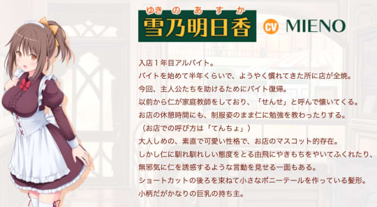https://al.dmm.co.jp/?lurl=https%3A%2F%2Fwww.dmm.co.jp%2Fmono%2Fpcgame%2F-%2Fdetail%2F%3D%2Fcid%3D587apc13853%2F&af_id=trip01-001&ch=toolbar&ch_id=link火事でなくなる前のファミーユでアルバイトをしていた雪乃明日香。