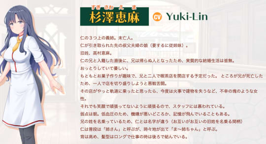 https://al.dmm.co.jp/?lurl=https%3A%2F%2Fwww.dmm.co.jp%2Fmono%2Fpcgame%2F-%2Fdetail%2F%3D%2Fcid%3D587apc13853%2F&af_id=trip01-001&ch=toolbar&ch_id=link杉澤恵麻は、主人公・高村仁の3つ年上の義姉で、すでに夫を亡くしています。