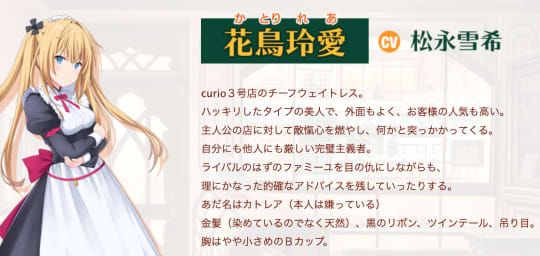 https://al.dmm.co.jp/?lurl=https%3A%2F%2Fwww.dmm.co.jp%2Fmono%2Fpcgame%2F-%2Fdetail%2F%3D%2Fcid%3D587apc13853%2F&af_id=trip01-001&ch=toolbar&ch_id=linkファミーユのライバル店であるcurio3号店でチーフを務めている花鳥玲愛。