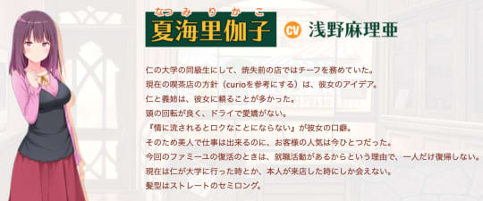 https://al.dmm.co.jp/?lurl=https%3A%2F%2Fwww.dmm.co.jp%2Fmono%2Fpcgame%2F-%2Fdetail%2F%3D%2Fcid%3D587apc13853%2F&af_id=trip01-001&ch=toolbar&ch_id=link中世ヨーロッパの街並みをイメージした、大型ショッピングモール『ブリックモール』。 グランドオープンを数ヵ月後に控え、人気飲食店の誘致を積極的に推し進めていた。 喫茶店『ファミーユ』。主人公、仁の義姉、恵麻が経営していた欧風アンティーク喫茶。 火災により、店舗を失った、その開店休業中の喫茶店に、ブリックモールより出店の依頼が舞い込んだ。 店の復興のチャンスとばかりに、散り散りになったスタッフをかき集める仁。 ひとり、またひとりと、戻ってきたり、こなかったりする仲間たち。 順風満帆とまではいかないまでも、なんとか開店準備が整ったとき、ほぼ同時に真向かいのお店の看板が掲げられた。 そこに描かれた名は‘‘curio’’。ファミーユと全く同じコンセプトの欧風アンティーク喫茶店。 それもそのはず。ファミーユは、curioの『二番煎じ』なのだから…