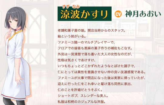 https://al.dmm.co.jp/?lurl=https%3A%2F%2Fwww.dmm.co.jp%2Fmono%2Fpcgame%2F-%2Fdetail%2F%3D%2Fcid%3D587apc13853%2F&af_id=trip01-001&ch=toolbar&ch_id=link火事で消失する前のファミーユで開店当初から働いていた老舗和菓子屋の娘である涼波かすり。