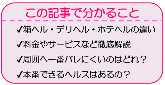 3種類のヘルス(箱ヘル・デリヘル・ホテヘル)の違いと特徴を解説!