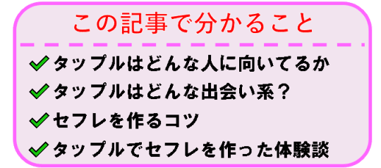 タップルを使ってセフレを作りたいと考えている人は、ぜひ読んでみてくださいね。