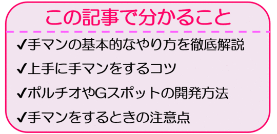 - Q手マンで気を付けることはありますか?A手マンをするときは爪をしっかり切るようにしましょう。また、フェザータッチで優しく、指は1本からゆっくり行いましょう。