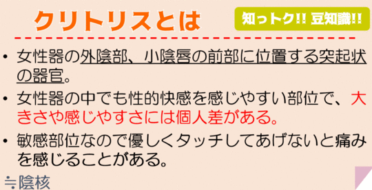 クリトリスは直径が数ミリ~1センチ程度の小さな突起物で、女性が一番感じる性感帯です。
